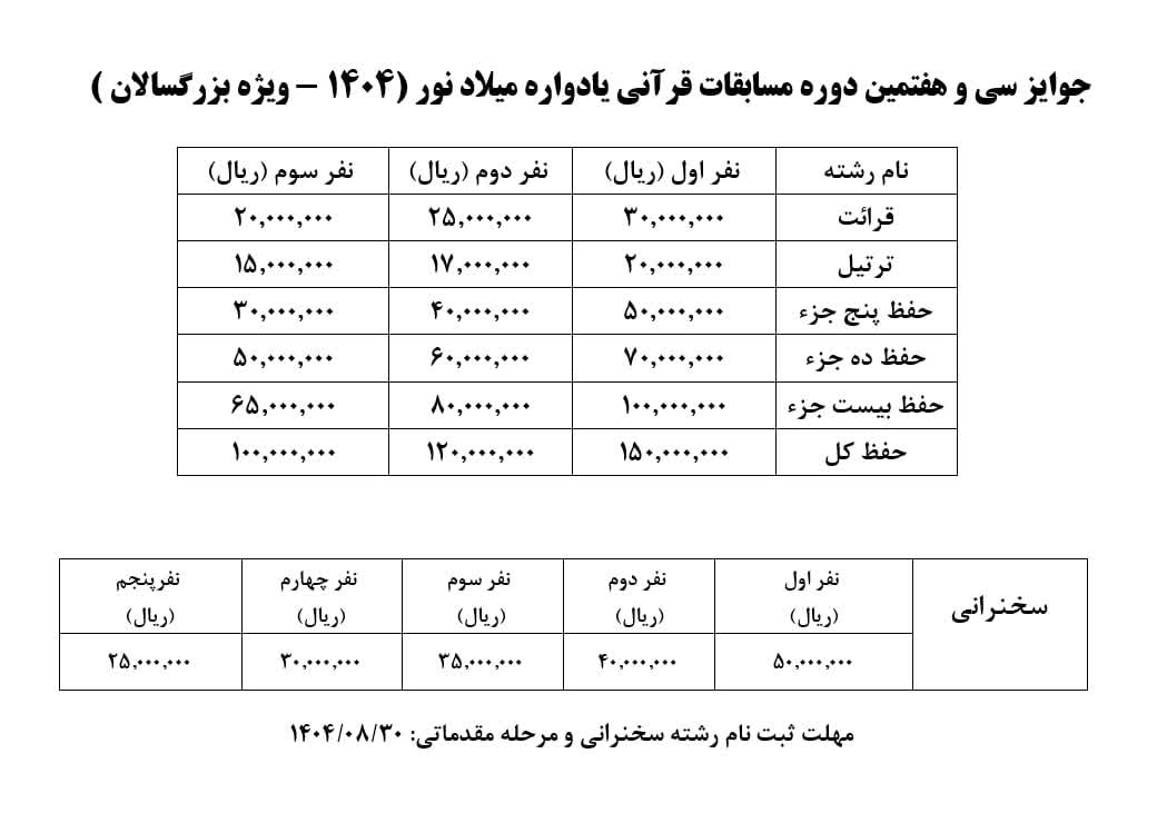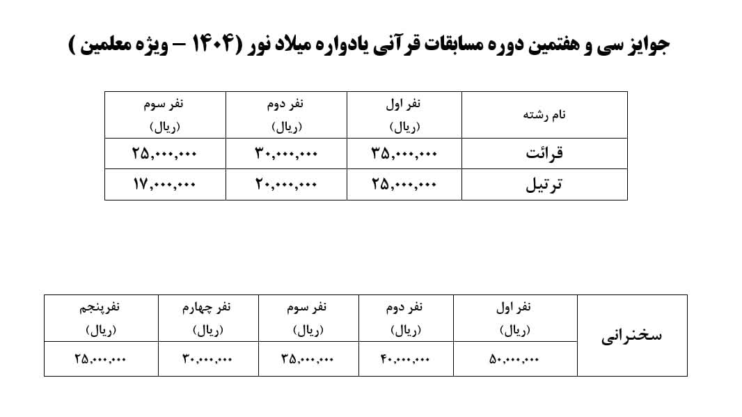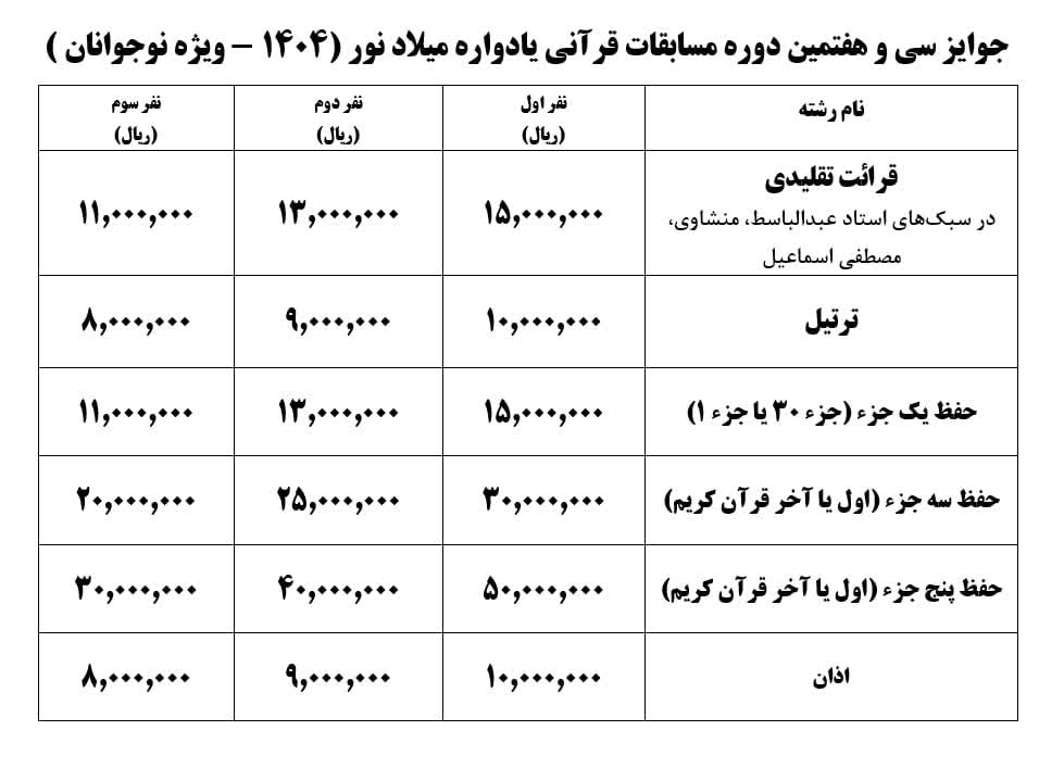 جوایز سی و هفتمین دوره مسابقات قرآنی میلاد نور